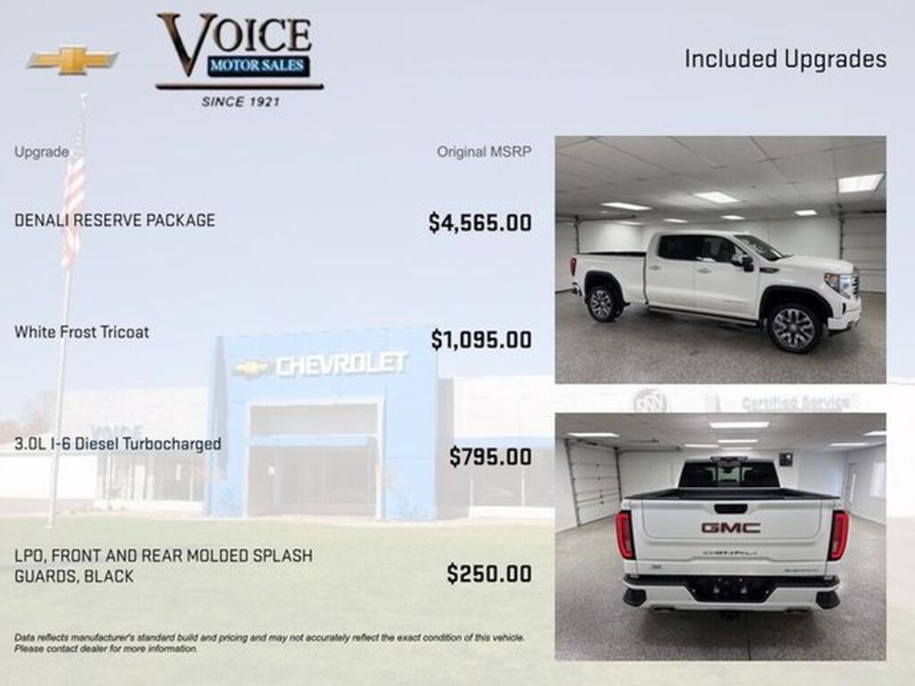 Denali Reserve Package: GMC MultiPro Power Steps; Power Sunroof; 22" X 9" Painted Aluminum Wheels Technology Package: Multi-Colour 15" Diagonal Head-Up Display; Rear Camera Mirror Preferred Equipment Group 5SA: Trailer Side Blind Zone Alert; Chrome Assist Steps; Forge Perforated Leather Seat Trim; Power Sliding Rear Window with Rear Defogger; 3.23 Rear Axle Ratio; Ultrasonic Front and Rear Park Assist; Trailer Camera Provisions; Electric Rear-Window Defogger; Theft Deterrent System (unauthorized Entry); Chrome Header with Signature Denali Chrome Grille; Front Rain-Sensing Wipers; Heavy-Duty Air Filter; 120-Volt Interior Power Outlet; Wireless Charging; Front Bucket Seats; Colour-Keyed Carpeting Floor Covering; OnStar and GMC Connected Services Capable; Heated 2nd Row Outboard Seats; Power Front Passenger Windows with Express Up/down; Power Rear Windows with Express Down; Integrated Trailer Brake Controller; HD Surround Vision; Power Rake and Telescoping Steering Column; Keyless Open and Start; Perimeter Lighting; Push Button Start; LED Cargo Area Lighting; Remote Vehicle Starter System; In-Vehicle Trailering System App; 7 100 lbs (3 221 Kgs) GVWR; Hill Descent Control; Floor-Mounted Centre Console; 170 Amp Alternator; Bed View Camera; Auxiliary External Transmission Oil Cooler; Rear Cross Traffic Braking; GMC Pro Safety; Trailering Package; 2 USB Ports; 2 Charge/data USB Ports Inside Centre Console; Denali Premium Suspension with Adaptive Ride Control; Chrome Recovery Hooks; Steering Wheel Audio Controls; 2 Charge-Only Rear USB Ports; GMC Connected Access Capable; Universal Home Remote; Premium GMC Infotainment Audio System Radio; 2-Speed Transfer Case; Deep-Tinted Glass; Spray-On Pickup Bedliner with Denali Logo; Hitch View; Power Front Windows with Driver Express Up/down; Rear Pedestrian Alert; Wi-Fi Hotspot Capable; Rear Wheelhouse Liners; Auto-Locking Rear Differential; Power Door Locks GMC MultiPro Power Steps Power Sunroof White Frost Tricoat Front and Rear Black Moulded Splash Guards Wheel Locks (set of 4) **Equipment listed is based on original vehi
